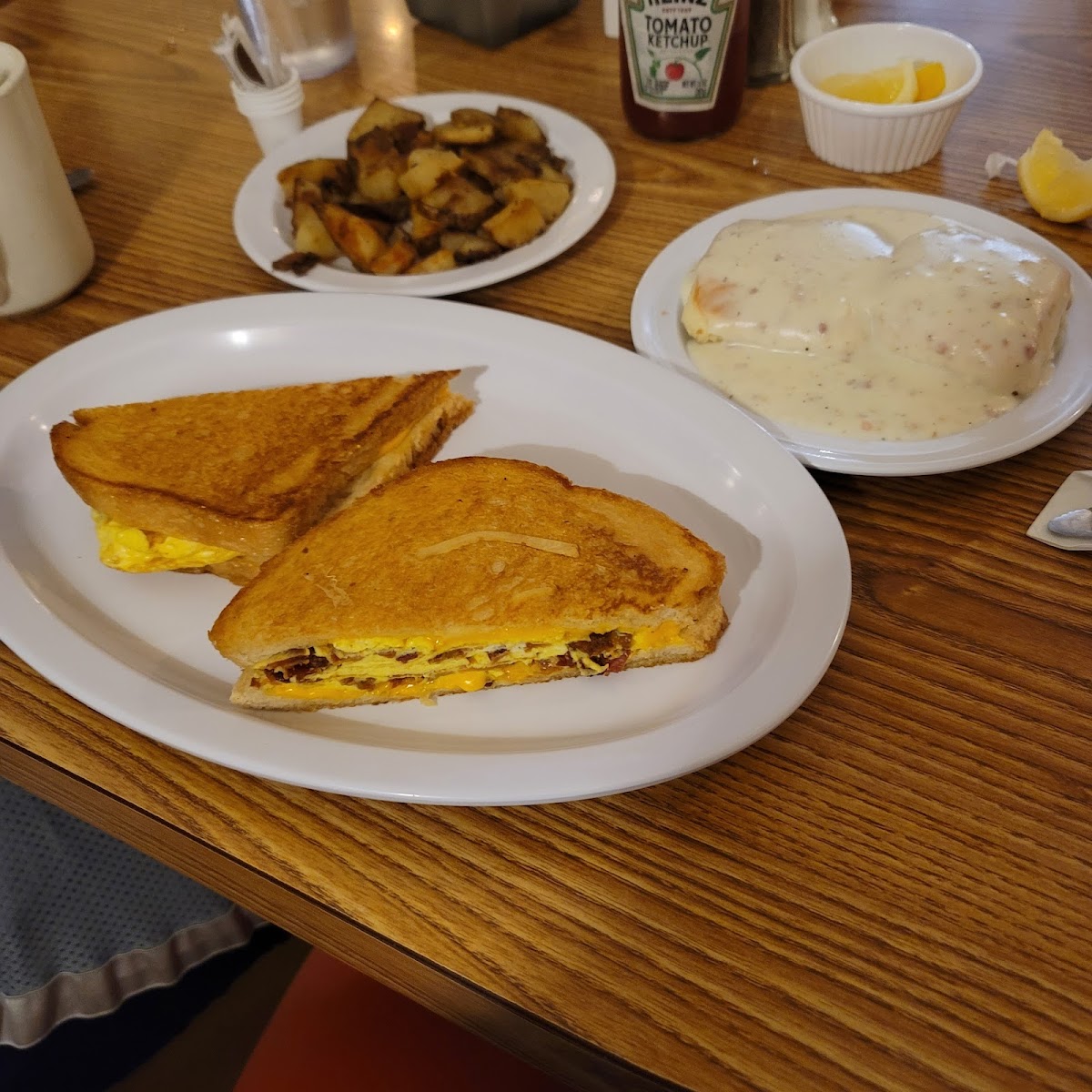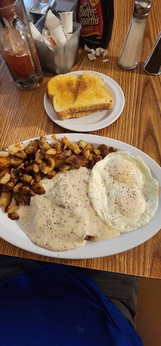 I went today for the first time in over 5 years. Went around 10:15am on a Monday. The hostess was Soo nice, sat us quickly even got our drinks. Our server was very fun and attentive. I had eggs and sausage plate with biscuits and gravy. The sausage was amazing. Not that tiny ones like other breakfast places. The biscuits were dence. The gravy could of been a little more thick for my liking but it was flavorful. My eggs were cooked perfect over medium. two other got the 2x4 with French toast, bacon and Sunnyside eggs. They were perfect and french toast was awesome. One other person got an order of biscuits and gravy with half potatoes..it was a higher portions she couldn't finish. I would definitely recommend this place to everyone. It's a local hidden gem. I can't believe I haven't been in so long.